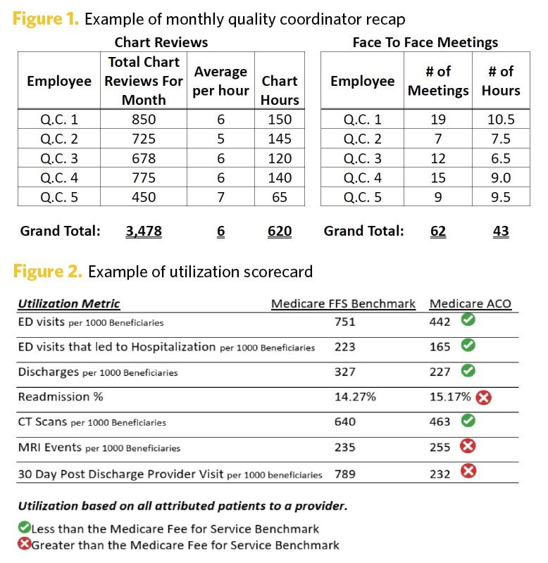 This recap also tracks providers who have left or joined to make notes about educating new providers on ACO goals, as well as any new or closed locations and any changes to the practices’ TINs.
