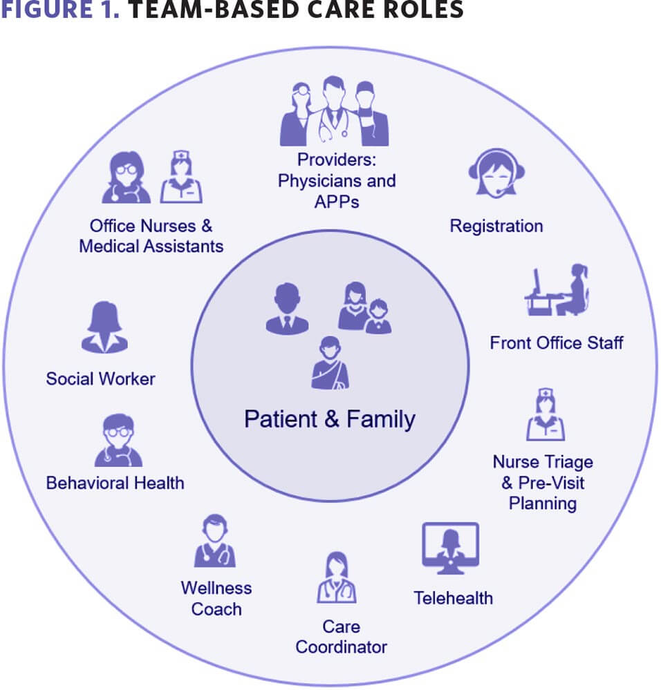 Team-based care refers to the delivery of health services through a multidisciplinary team working collaboratively with patients and their caregivers to achieve coordinated care with high-quality outcomes. Focused on shared goals across various care settings, team-based care promotes the shift from episodic care to comprehensive care in the ambulatory setting. Expanded team-based care models address social determinants of health (SDoH), including social services (housing, nutrition, adaptive equipment in the home), behavioral health, and wellness coaches and navigators.
