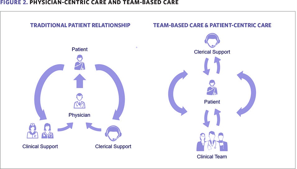 Team-based care promotes patient-centric care because it is designed to be more comprehensive and accessible to patients.2 Implemented well, it can enhance efficiency and effectiveness through improved access and promote comprehensiveness and coordination of care. However, the transition to team-based care often requires a reorientation of roles and responsibilities and how providers interact among the team and with the patient. Team members should be authorized to convey information to the patient, instead of channeling all patient communications through the physician.