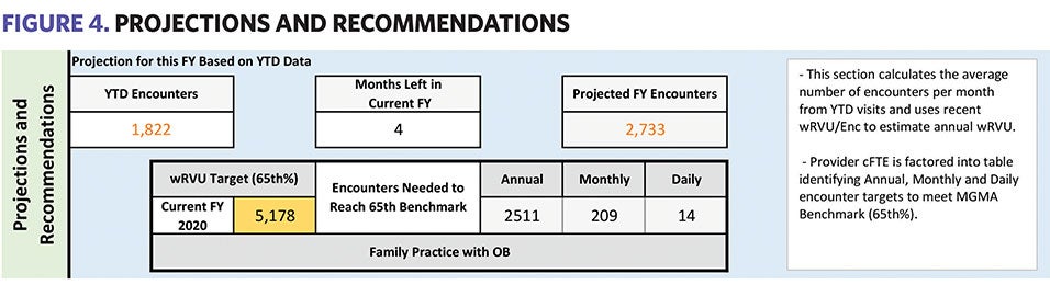 Taking account of the provider’s average wRVU per encounter allows this Patient Capacity Management Tool to identify potential impacts on productivity as well as assist clinic leaders to discuss goals. Figure 4 shows the total number of completed encounters year to date (YTD). It is used to determine the current average number of visits per month, which helps provide an estimate of the total encounters for the current fiscal year. Moreover, this section of the tool provides a gauge of whether a provider will meet the MGMA benchmark target (65th percentile) by calculating the number of encounters seen and the provider’s average wRVU per encounter. The provider in this example is projected to go beyond the 65th percentile goal (2,511 encounters) based on the 1,822 YTD encounters and applying the average to the four remaining fiscal year months. Conducting this review quarterly helps adjust the provider’s schedule proactively, especially when onboarding new providers.