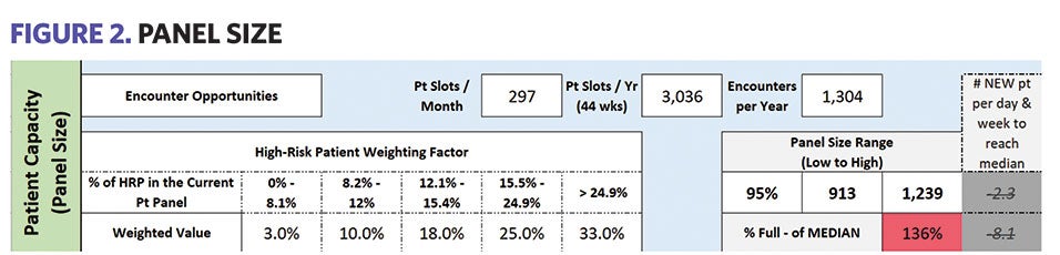 Healthcare organizations strive to strike a balance between provider workload and patient volume to set panel size benchmarks, which are usually derived from supply and demand calculation and results between 1,800 and 2,500 patients.1,2,3,4 One group even incorporated new technology such as machine learning to account for variables of time across different care encounters.5
