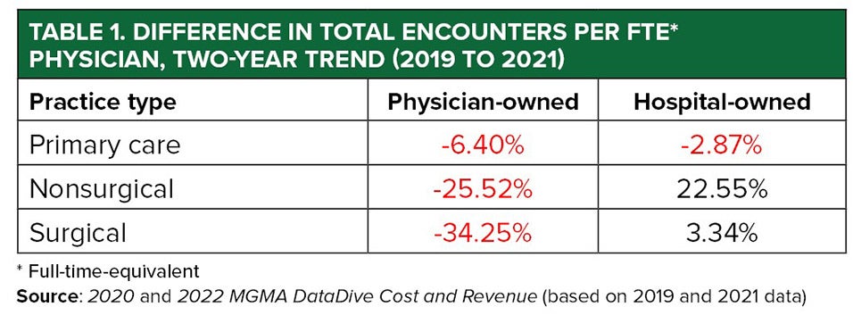 Case in point: the MGMA DataDive Cost and Revenue data set offers benchmarks for total encounters per full-time-equivalent (FTE) physician (Table 1) that, trended over time, help reveal how different ownership models fared from pre-COVID-19 pandemic years to recovery.