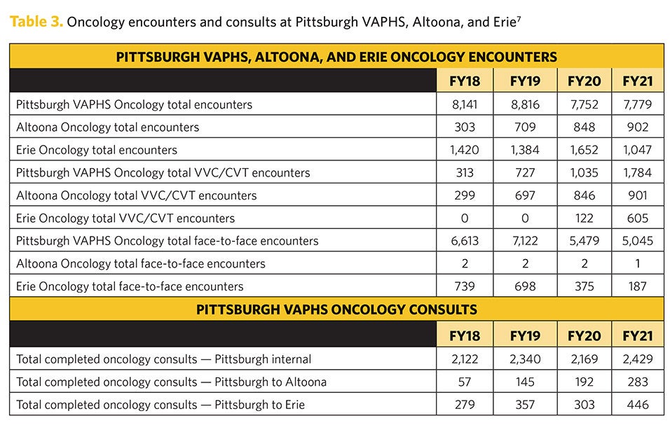 Even during the COVID-19 pandemic, oncology encounters remained relatively the same for the combination of Pittsburgh VAPHS, Erie, and Altoona sites, but the Altoona encounter location showed a threefold increase. The mode of delivery changed for all sites: