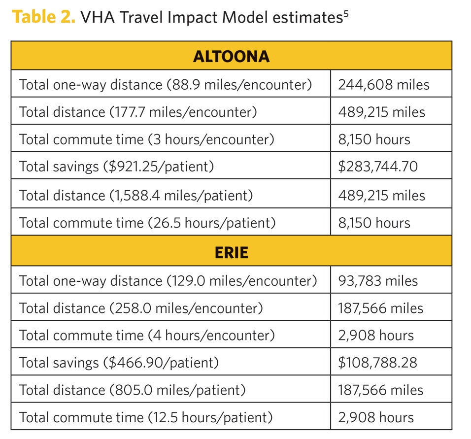 The appropriate use of the virtual cancer care clinic visits within the Pittsburgh OCCM reduced the financial burden and time commitment for the Veteran, providers, and VHA health system travel programs due to distance, time, and costs, while enhancing the Veteran’s satisfaction by delivering care closer to home. The VHA Travel Impact Model indicates a potential total commute time savings from FY18 to FY21 for Altoona Veterans of 8,150 hours at a potential cost of $283,744.70; for Erie Veterans, the total potential savings is 2,908 hours at $108,078.28 (See Table 2).