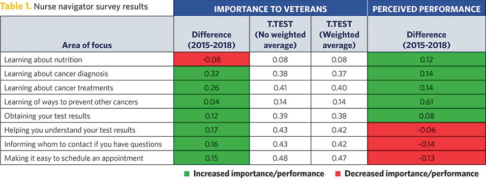 Through coordinating with the triaging oncology providers, navigators expedite the ability for providers to evaluate and determine if the case is ready to be accepted, ensuring cases referred to specialty care are complete with all relevant records, pathologies, images and labs. Veterans also saw a performance improvement of 0.08 between FY 2015 and 2018 in obtaining test results, which potentially impacts Veteran satisfaction and clinical outcomes. (See Table 1).