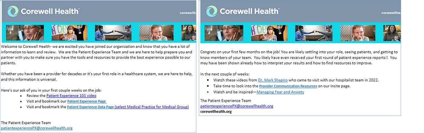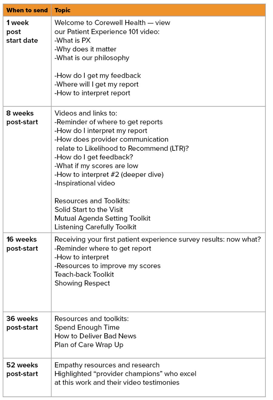 The next step in this process was integrating with our human resources system to ensure that any new provider would receive this pushed education after starting with us. The education is set up to push out at a certain number of days after the provider’s start date in five emails. In addition, each new provider’s peer guide features patient experience as a checklist item, so they are aware this education will be coming.