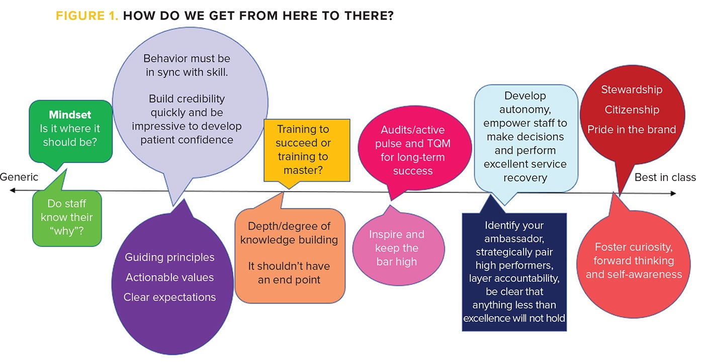 This article will focus on the outpatient arm of healthcare, as value-based care influences the transition to prevention and moves the lens of health away from episodic care. Our patients first connect with us at the point of service. Customer service in essence is the behavior that leads to satisfaction, including speech, tone and non-verbal cues. Because patient expectations are a moving target, meaningful engagement relies on having the right knowledge and understanding in place. It’s the staff’s expertise and knowledge that solidify their lasting skills and allow them to make the leap from competency to mastery. This learning process is designed to build a high-performing team while also fostering autonomy and self-actualization based on self-confidence and a powerful sense of purpose. What would this look like at the point of service?