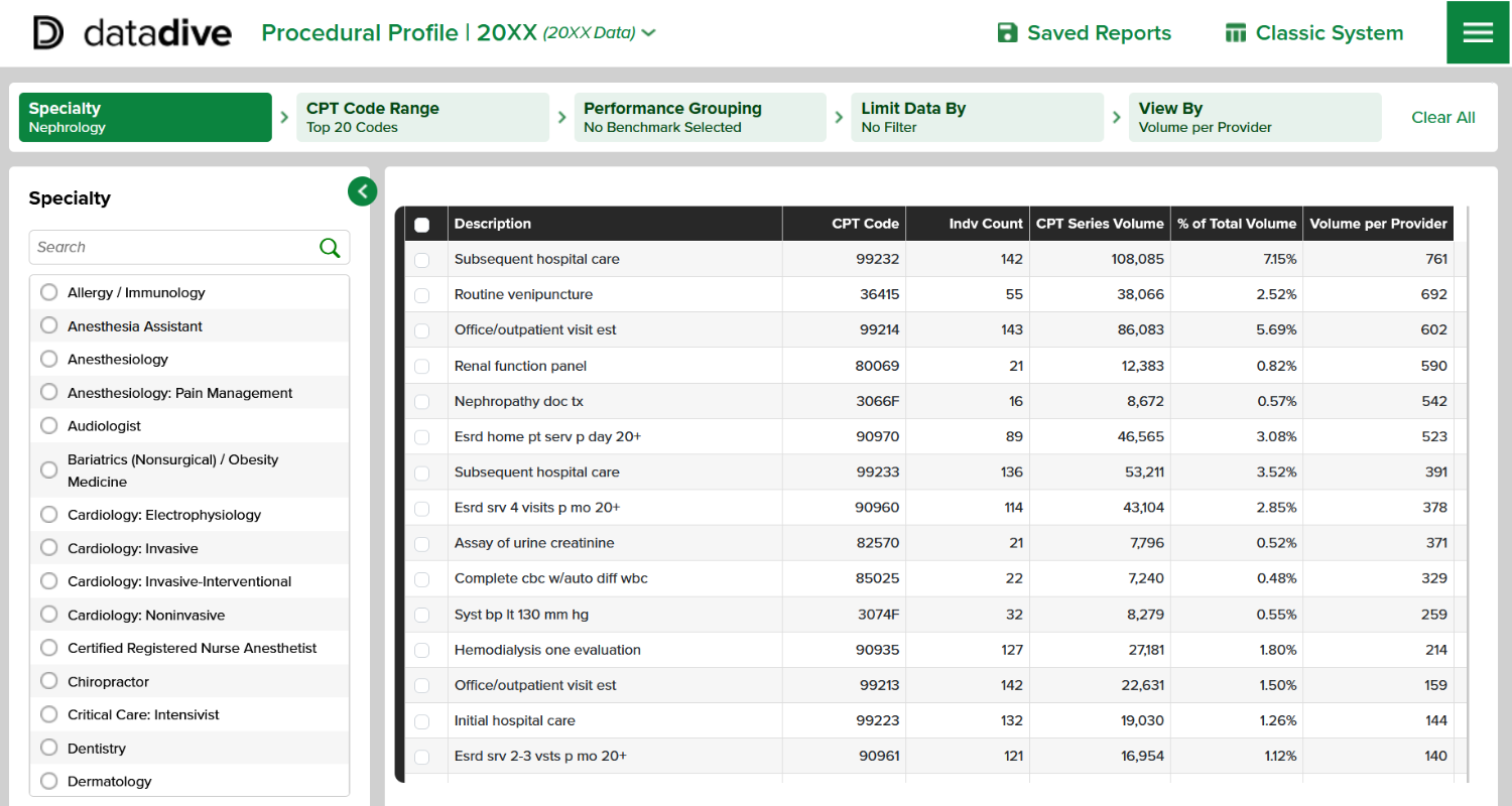 This intelligent and intuitive tool lets you compare the volume of each code performed against the total volume of codes performed as well as the volume per provider. You can also view the Top 20 Codes performed by other physicians in a specialty to see how your providers stack up. In addition, the benchmarks can reveal new opportunities and service lines that may have been previously overlooked.