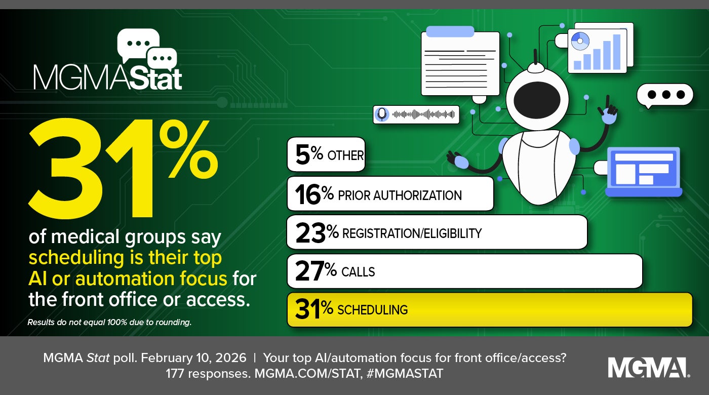 Our Feb. 10, 2026, MGMA Stat poll gives a sense where your peers in other practices are circling back to AI and automation to improve access with cost-effective strategies. Atop the list was scheduling (31%), followed by calls (27%), registration/eligibility (23%), prior authorization (16%), and “other” (5%). The poll had 177 applicable responses. [Editor's note: The figures do not total 100% due to rounding.]