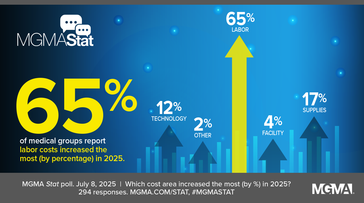 A July 8, 2025, MGMA Stat poll found that nearly two-thirds (65%) of practice leaders point to labor as the area with the biggest cost increase by percentage, followed by supplies (17%), technology (12%), facilities (4%), and “other” (2%). The poll had 294 applicable responses.