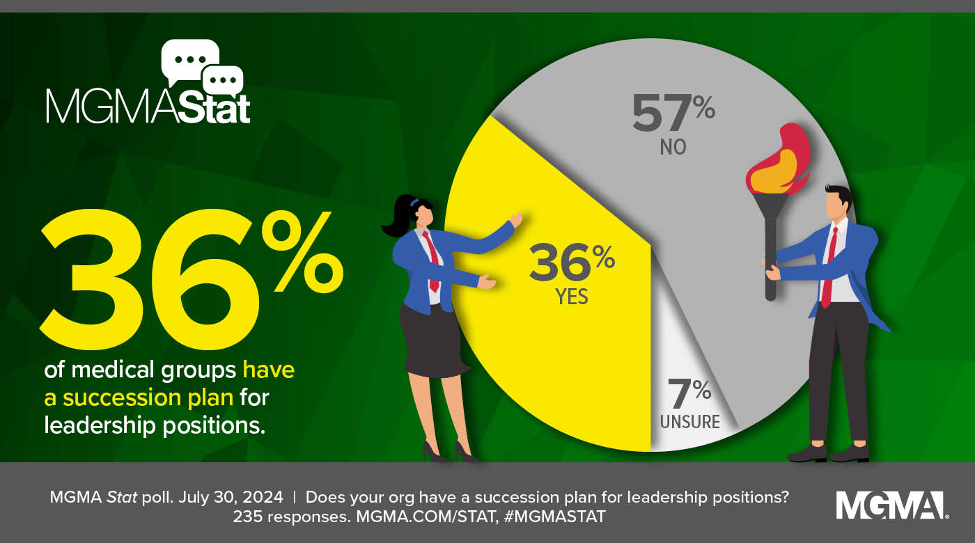 A July 30, 2024, MGMA Stat poll found that just more than one in three (36%) of medical group leaders report having a succession plan for leadership positions, while 57% did not and another 7% were unsure. The poll had 235 applicable responses.
