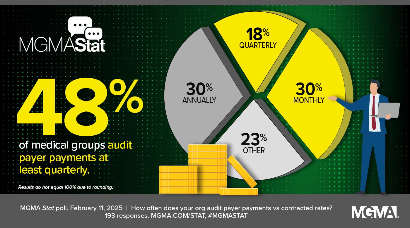 A Feb. 11, 2025, MGMA Stat poll found that nearly half (48%) of medical group practice leaders report auditing payer payments versus contracted rates either monthly (30%) or quarterly (18%), while another 30% do so annually and 23% responded “other.” The poll had 193 applicable responses.