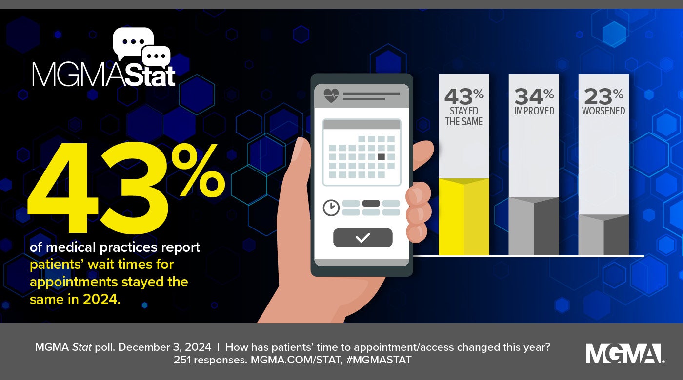 A Dec. 3, 2024, MGMA Stat poll found that 77% of practice leaders said their organizations’ wait times for patient appointments either improved (34%) or stayed the same (43%) in 2024, while 23% said wait times worsened. The poll had 251 applicable responses.