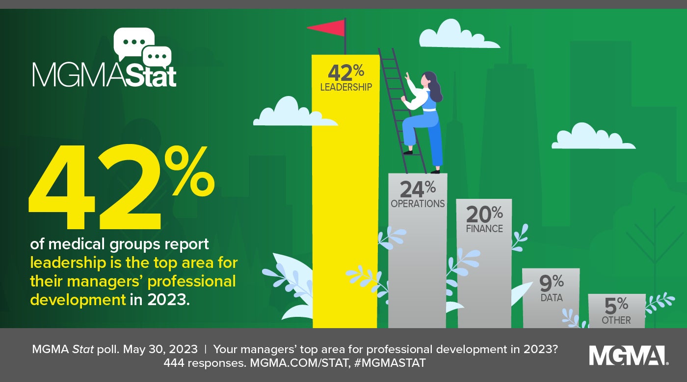 A May 30, 2023, MGMA Stat poll asked healthcare leaders the top areas on which they want to focus for their managers’ professional development this year, and more than 4 in 10 (42%) cited leadership as the top answer, followed by:
